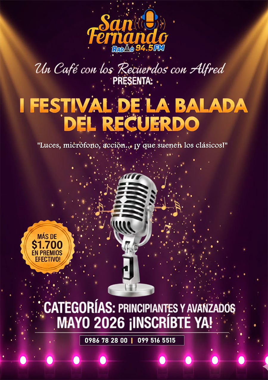 Tradición y Sentimiento en nuestras Fiestas de Cantonización En el mes de mayo, San Fernando se viste de gala para celebrar su cantonización. Como parte fundamental de estos festejos, la Radio 94.5 FM y el programa «Un Café con los Recuerdos», bajo la conducción de Alfredo Peralta, unen esfuerzos para organizar este festival que busca dar el máximo realce a nuestra tierra y a su gente.